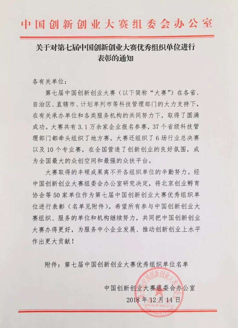 12月14日,集團被中國創(chuàng)新創(chuàng)業(yè)大賽組委會授予“第七屆中國創(chuàng)新創(chuàng)業(yè)大賽優(yōu)秀組織單位”。