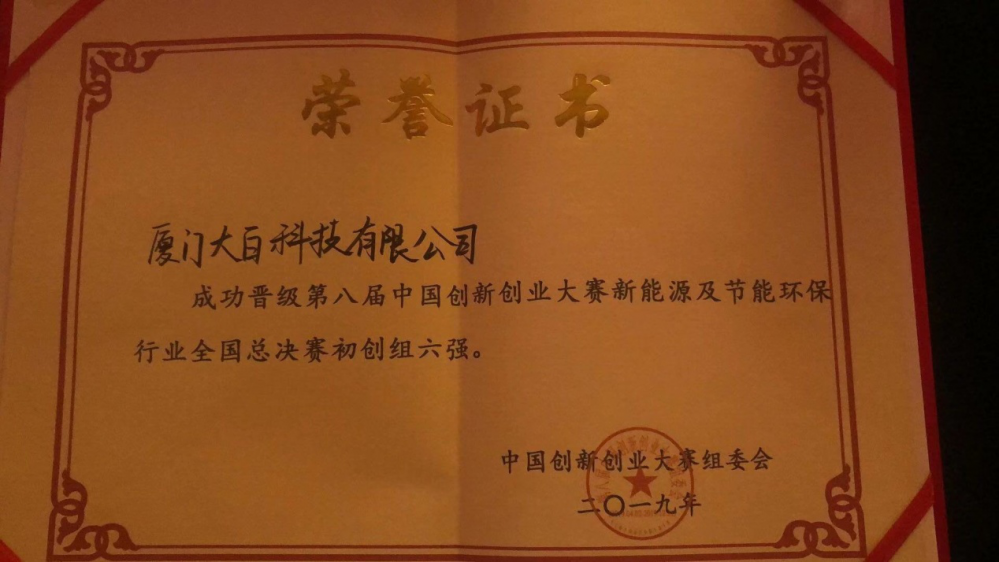 2019年11月25-28日,第八屆中國創(chuàng)新創(chuàng)業(yè)大賽新能源及節(jié)能環(huán)保行業(yè)總決賽在宜春舉行。經(jīng)過激烈角逐,最終廈門賽區(qū)的廈門大白科技有限公司獲得本次總決賽的初創(chuàng)企業(yè)組六強、優(yōu)秀獎。此外,廈門兌泰實業(yè)科技有限公司獲得本屆中國創(chuàng)新創(chuàng)業(yè)大賽新能源及節(jié)能環(huán)保行業(yè)總決賽優(yōu)秀獎。