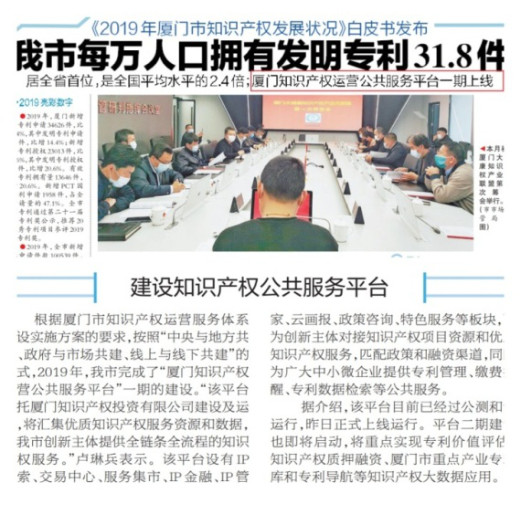 2020年4月20日由廈門市市場監(jiān)督管理局召開新聞發(fā)布會(huì),宣布平臺(一期)正式上線;平臺是根據(jù)廈門市知識產(chǎn)權(quán)運(yùn)營服務(wù)體系建設(shè)實(shí)施方案的要求,在廈門市市場監(jiān)督管理局(知識產(chǎn)權(quán)局)指導(dǎo)下設(shè)立的公共服務(wù)平臺。平臺匯集優(yōu)質(zhì)知識產(chǎn)權(quán)服務(wù)資源和數(shù)據(jù),通過線上平臺和線下園區(qū)服務(wù)中心構(gòu)建便民利民的知識產(chǎn)權(quán)公共服務(wù)體系,為我市創(chuàng)新主體提供全鏈條全流程的知識產(chǎn)權(quán)服務(wù)。