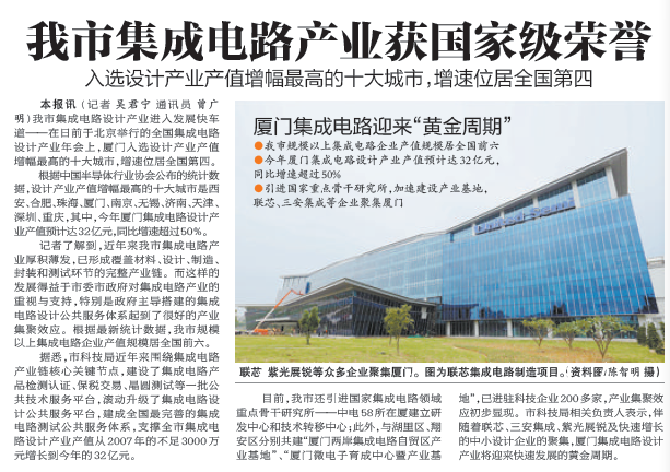 在全國集成電路設(shè)計產(chǎn)業(yè)年會上,廈門入選設(shè)計產(chǎn)業(yè)增幅最高的十大城市,增速位居全國第四。