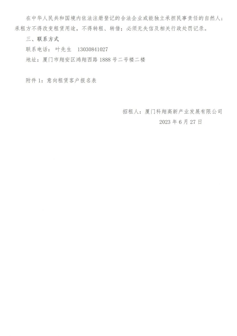 廈門科翔高新產(chǎn)業(yè)發(fā)展有限公司房產(chǎn)招租公告 欄目:通知公告 來源:廈門科技產(chǎn)業(yè)化集團(tuán) 時(shí)間:2023-06-28 熱度:205 廈門科翔高新產(chǎn)業(yè)發(fā)展有限公司房產(chǎn)招租公告2023.6.27.docx