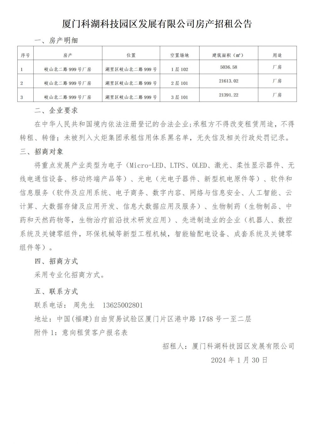 廈門(mén)科湖科技園區(qū)發(fā)展有限公司房產(chǎn)招租公告 欄目:通知公告 來(lái)源:廈門(mén)科技產(chǎn)業(yè)化集團(tuán) 時(shí)間:2024-01-29 熱度:235